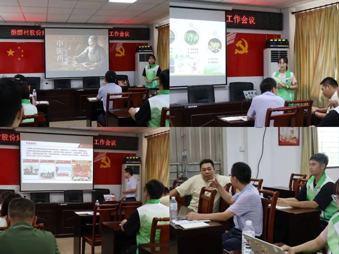 团队成员在酥醪村委会议室开展了党建+中医药文化科普以及甜茶科研成果科普宣讲活动。首先由汤丹老师对我校在相关领域的扶持政策、重点发展方向及已取得的阶段性研究成果进行了清晰梳理与简要介绍,并围绕习关于中医药的重要论述展开深入解读;随后,突击队成员郝筱彤聚焦“让中医药文化贴近群众”的目标,面向村民开展中医药文化知识普及,进一步增进对中医药文化的理解与认同;突击队成员曾琛悦带来团队关于酥醪甜茶的专项研究成果分享。她详细阐述了团队在甜茶品种选育、成分分析、功效验证等方面的研究过程与核心发现,让在场人员充分了解甜茶的价值与发展潜力,为甜茶产业助力乡村发展提供了专业参考。